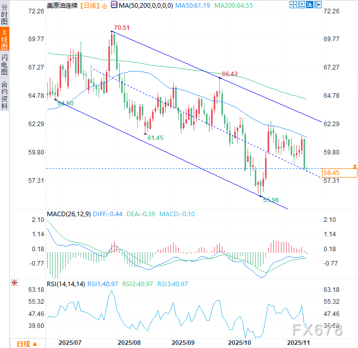 下行方面,58.00美元构成初步支撑,一旦跌破56美元,或进一步强化空头动能,10月低点55.96美元支撑位将再度成为市场焦点。